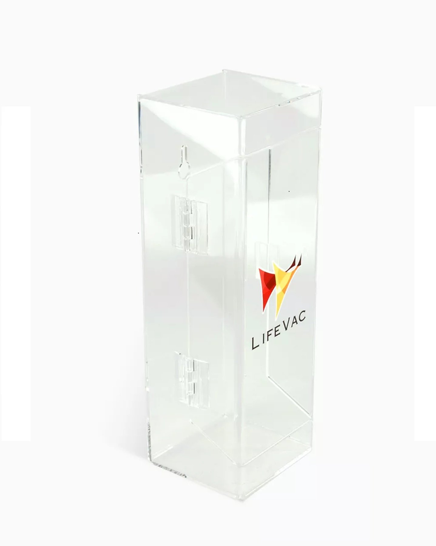 The LifeVac clear wall mount case is made of acrylic and features a swing door for easy access to the device. Perfect for common areas such as school cafeteria, and corporate meeting space.